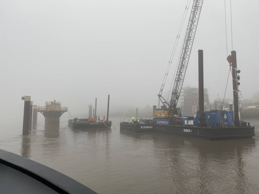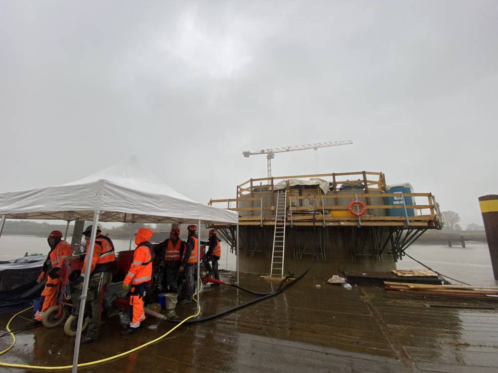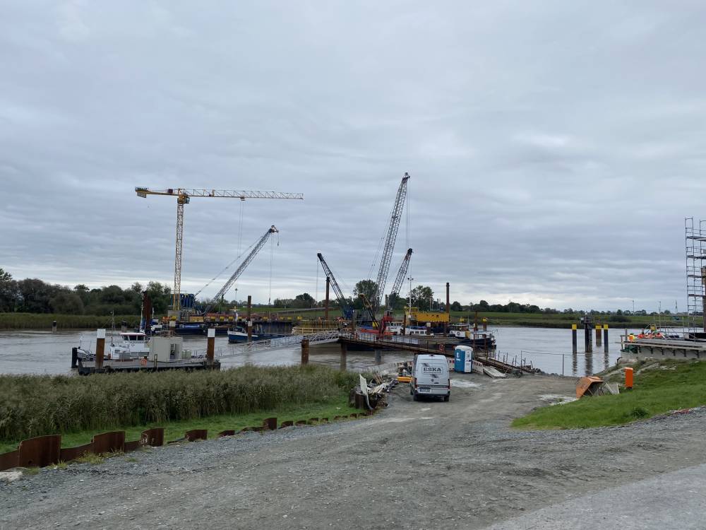 Ein besonderes Ereignis war das Verpressen der Achse 20, mitten im Stromfeld der Ems. Hierfür musste die Maschinentechnik auf ein Schiff geladen und anschließend auf ein schwimmenden Ponton am Pfeiler abgeladen werden. Während der Arbeiten konnte dann der Tidenhub von ca. 5m deutlich wahrgenommen werden. Auch zu diesem Einsatz war das Wetter stürmisch und regnerisch, weshalb die Maschinentechnik stets unter einen großen Pavillion aufgebaut wurde.
