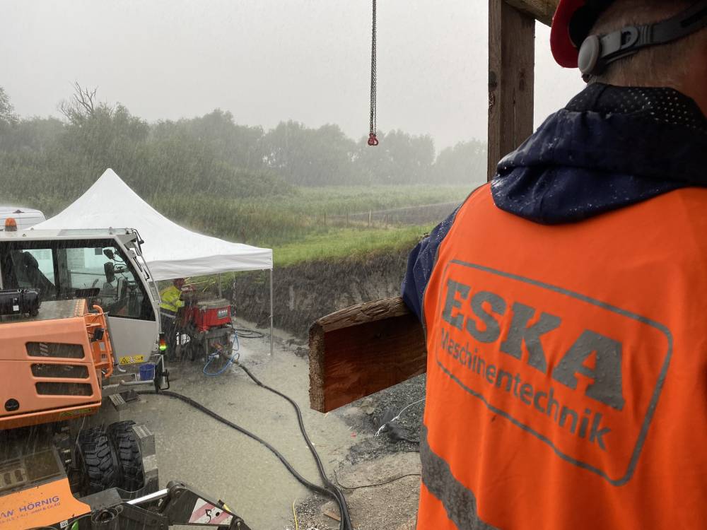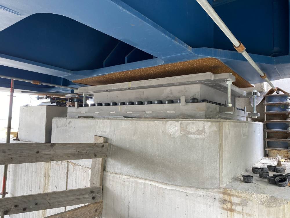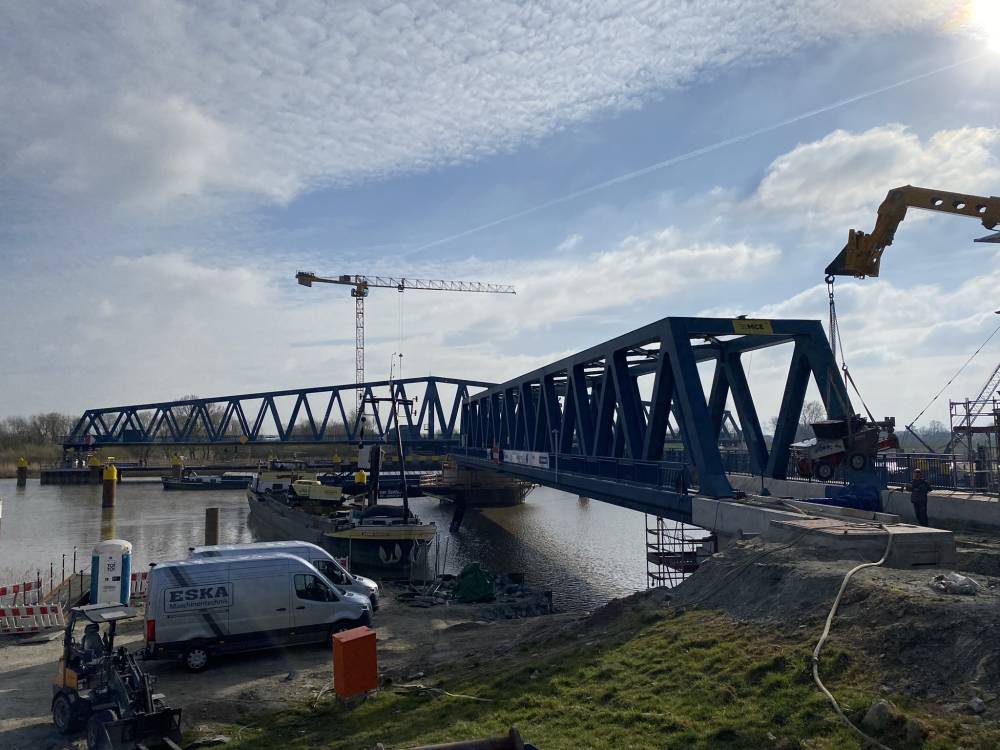 Die Firma Eska Maschinentechnik war bei diesem beeindruckenden Bauprojekt beteiligt und hat die verschiedenen Brückenlager mit Spezialbeton verpresst. In den Jahren 2024 und 2025 wurden bei mehreren Einsätzen ca. 60t Vergussbeton an den Achsen der Vorlandbrücke und der Hub-Drehbrücke verpumpt.